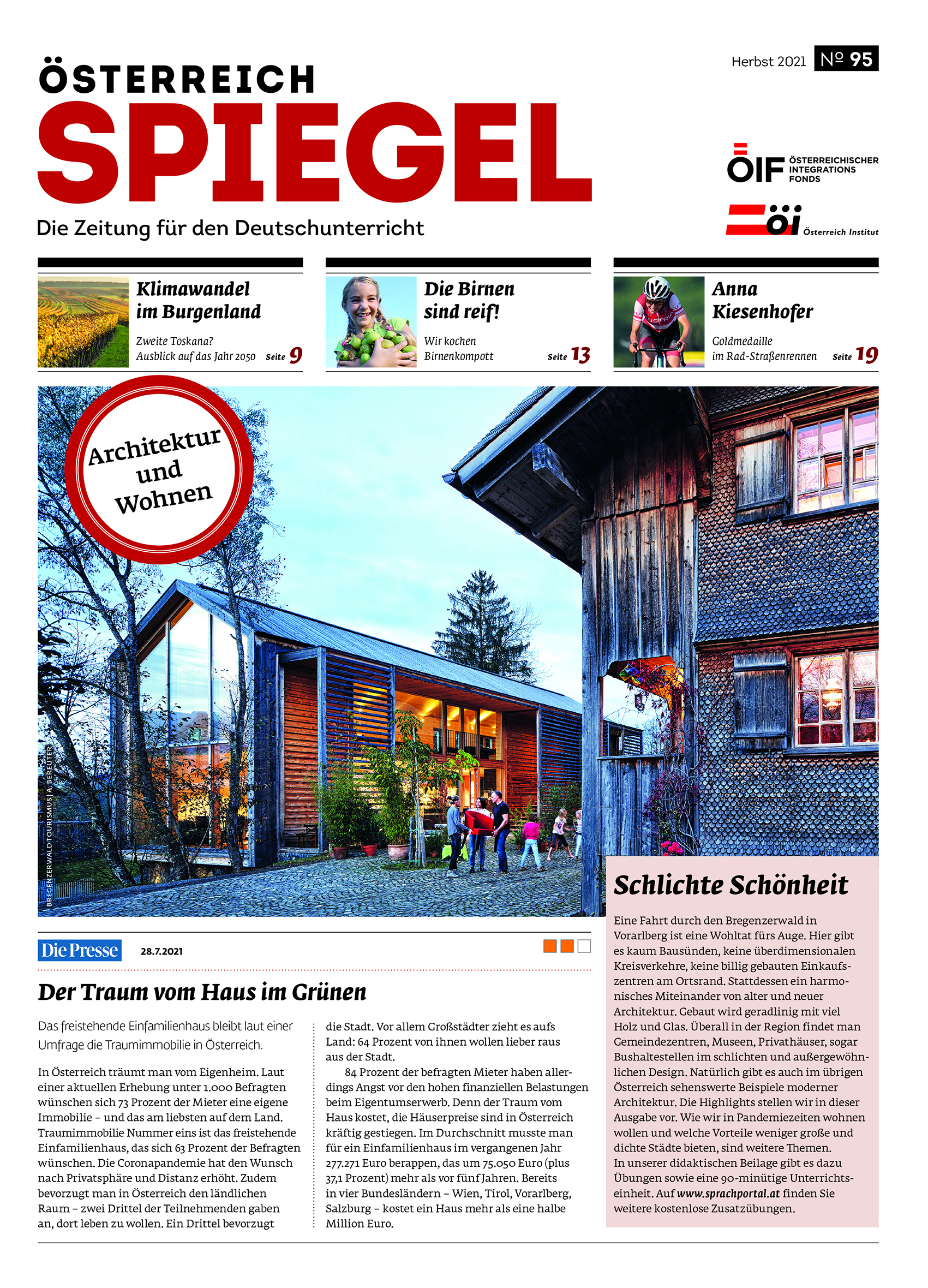 Österreich Spiegel su didaktičke novine koje se koriste kao dodatni materijal u nastavi, a koje izdaje Austrijski institut u saradnji sa Austrijskim integracionim fondom. Bilo da predajete njemački ili da ga učite, Österreich Spiegel je idealna dopuna u nastavi ili učenju jezika. Novo izdanje Österreich Spiegela nudi Vam širok izbor tema kao što su: priroda i društvo, zanati u Austriji, porodica i društvo, jela i pića, integracija i suživot, umjetnost i kultura, sport i slobodno vrijeme.